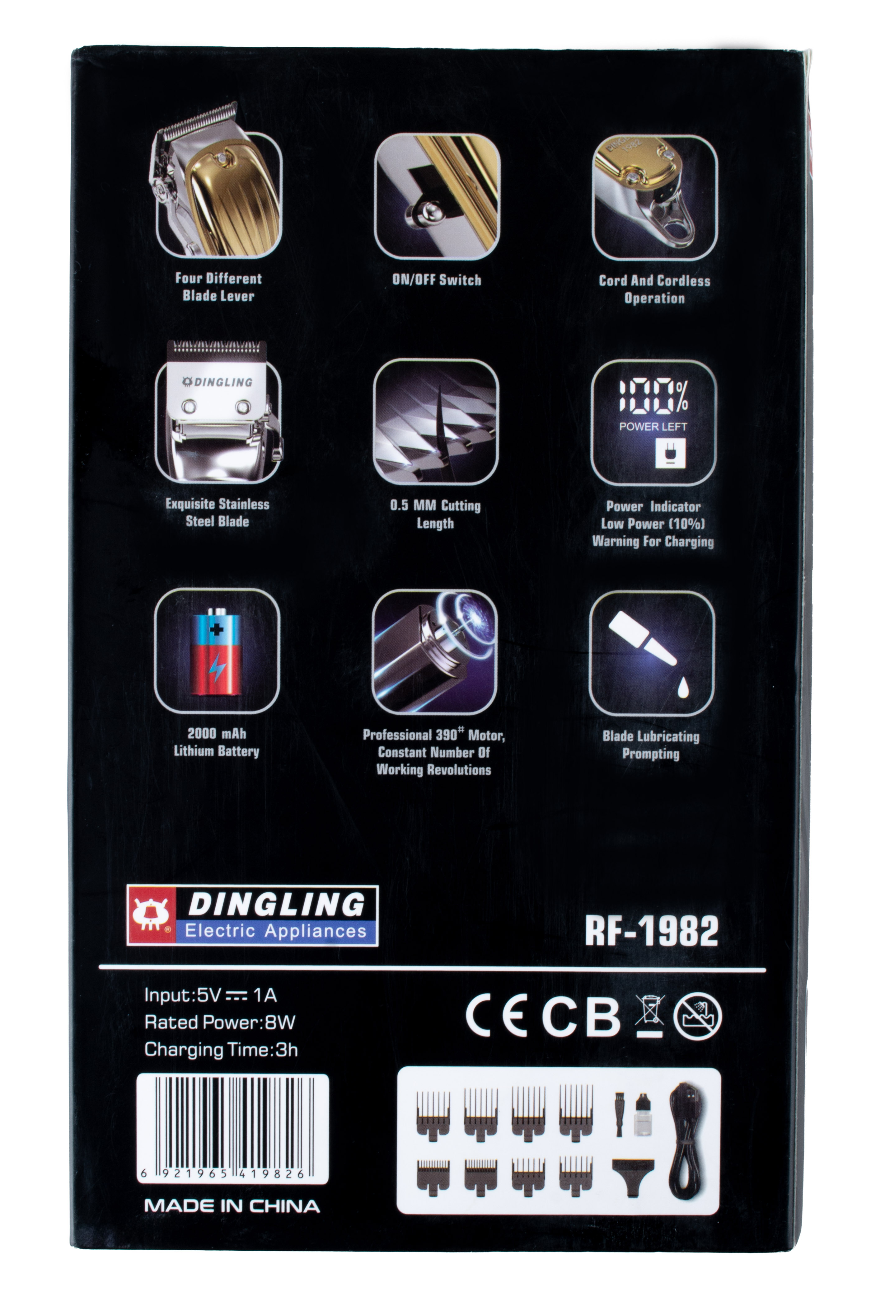 Η Dingling RF-1982 είναι μια επαγγελματική, επαναφορτιζόμενη κουρευτική μηχανή (hair clipper) σε χρυσό χρώμα, η οποία προσφέρει ασύρματη λειτουργία, ακριβείς ατσάλινες λεπίδες και ρυθμιζόμενες ταχύτητες κοπής. Διαθέτει ενσωματωμένη μπαταρία, ρυθμιζόμενο μήκος κοπής 3 επιπέδων και συνοδεύεται από καλώδιο USB για φόρτιση, προσφέροντας ανθεκτικότητα και ακρίβεια.